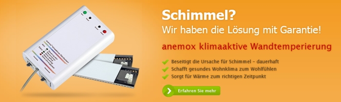 Mit der anemox klimaaktiven Wandtemperierung bieten wir eine dauerhafte und nachhaltige Lösung zur Beseitigung der Ursachen für die Bildung von Schimmel an Wänden. Das selbstregulierende Wandsystem erwärmt in kritischen Situationen die Wand, bis die Gefahr von Feuchtigkeit und damit der Schimmelbildung nicht mehr besteht. | |||||
